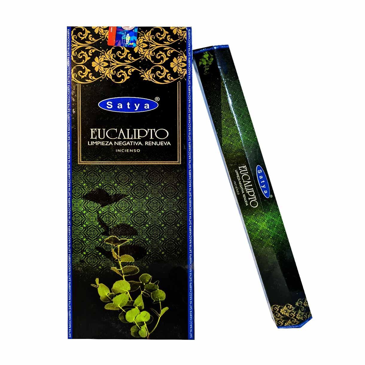 Incienso hexagonal premium con aroma a Eucalipto de la marca Satya (misma marca del Nag Champa azul tradicional).