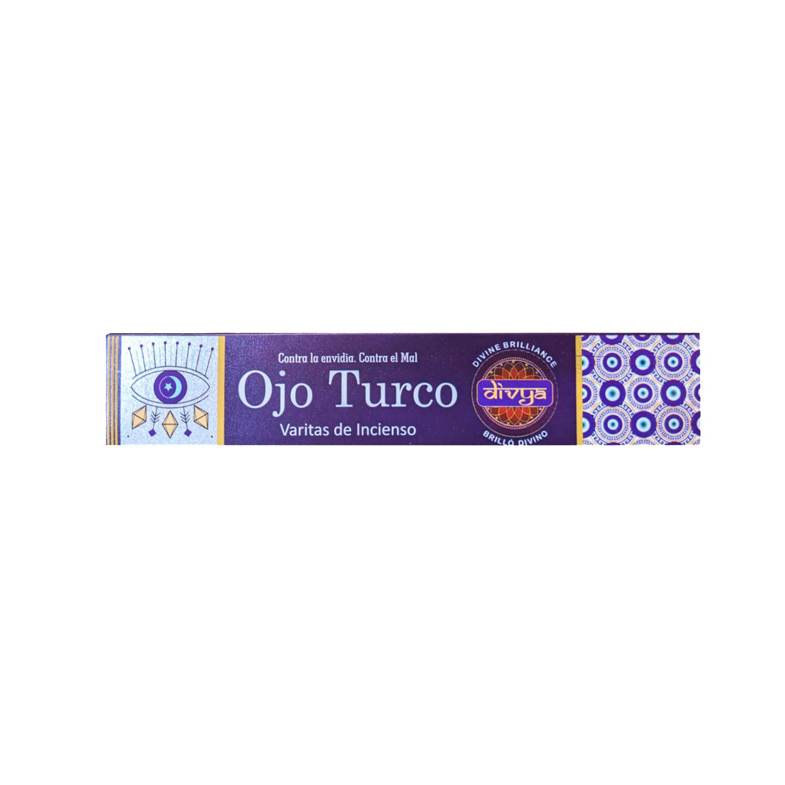 Incienso de Ojo Turco linea Divya Contenido de la caja: 12 cajitas de 15 varitas c/u Total de la caja: 180 varitas. Formato: Varillas. Producto hecho en la india