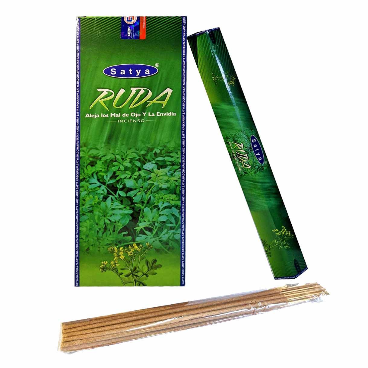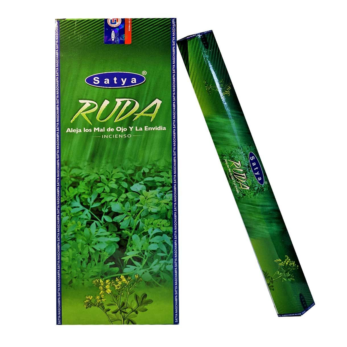 Incienso hexagonal premium con aroma a Ruda de la marca Satya (misma marca del Nag Champa azul tradicional).