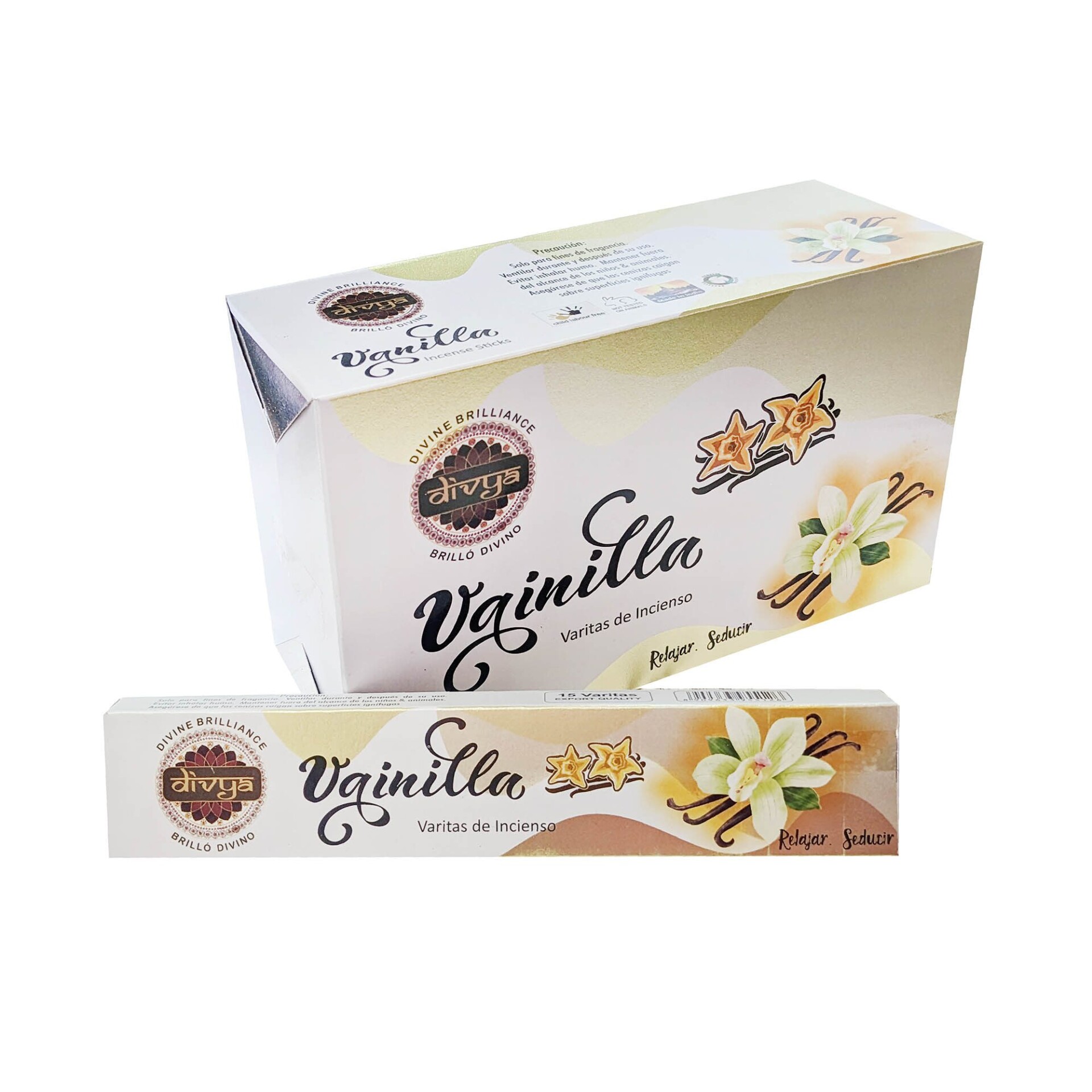 Incienso de Vainilla linea Divya Contenido de la caja: 12 cajitas de 15 varitas c/u Total de la caja: 180 varitas. Formato: Varillas. Producto hecho en la india