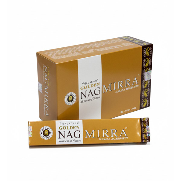 Incienso Golden Nag Mirra de Vijayshree. Varitas de Masala. La caja contiene 12 cajitas de 15g c/u (11 varitas aprox en cada cajita) Total de la caja: 180g. Producto hecho en la India.