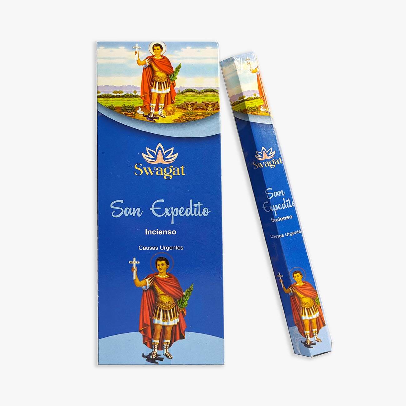 Incienso San Expedito hexagonal Swagat. La caja trae 6 tubos hexagonales de 20 varitas cada uno haciendo un total de 120 varitas.