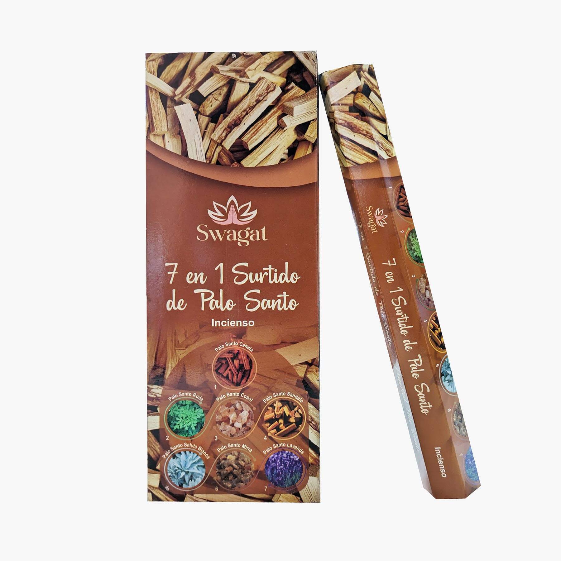 Incienso Surtido de Palo Santo hexagonal Swagat. La caja trae 6 tubos hexagonales de 20 varitas cada uno haciendo un total de 120 varitas.