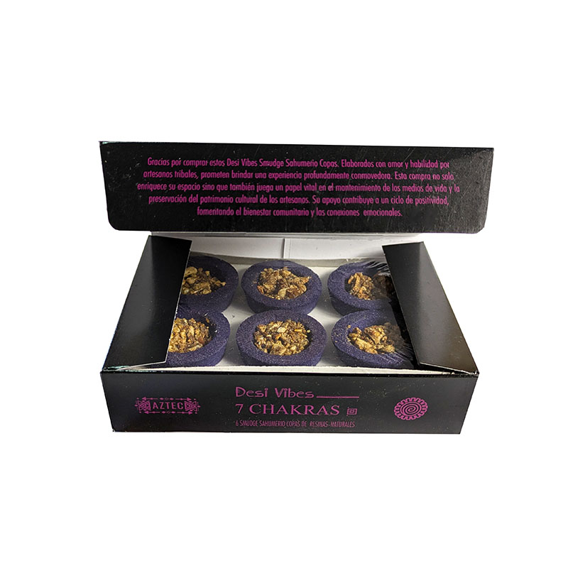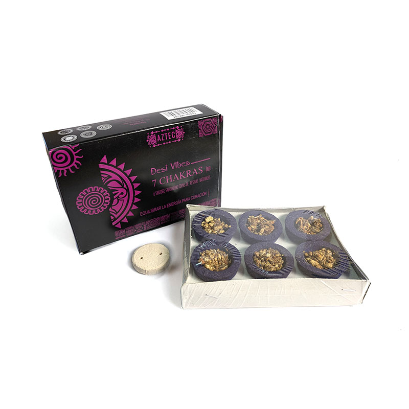 Sahumerio 7 Chakras Desi Vibes Carbón con resina   Contenido: 6 conitos con resina Marca: Desi Vibes Propósito: Equilibrar la energía