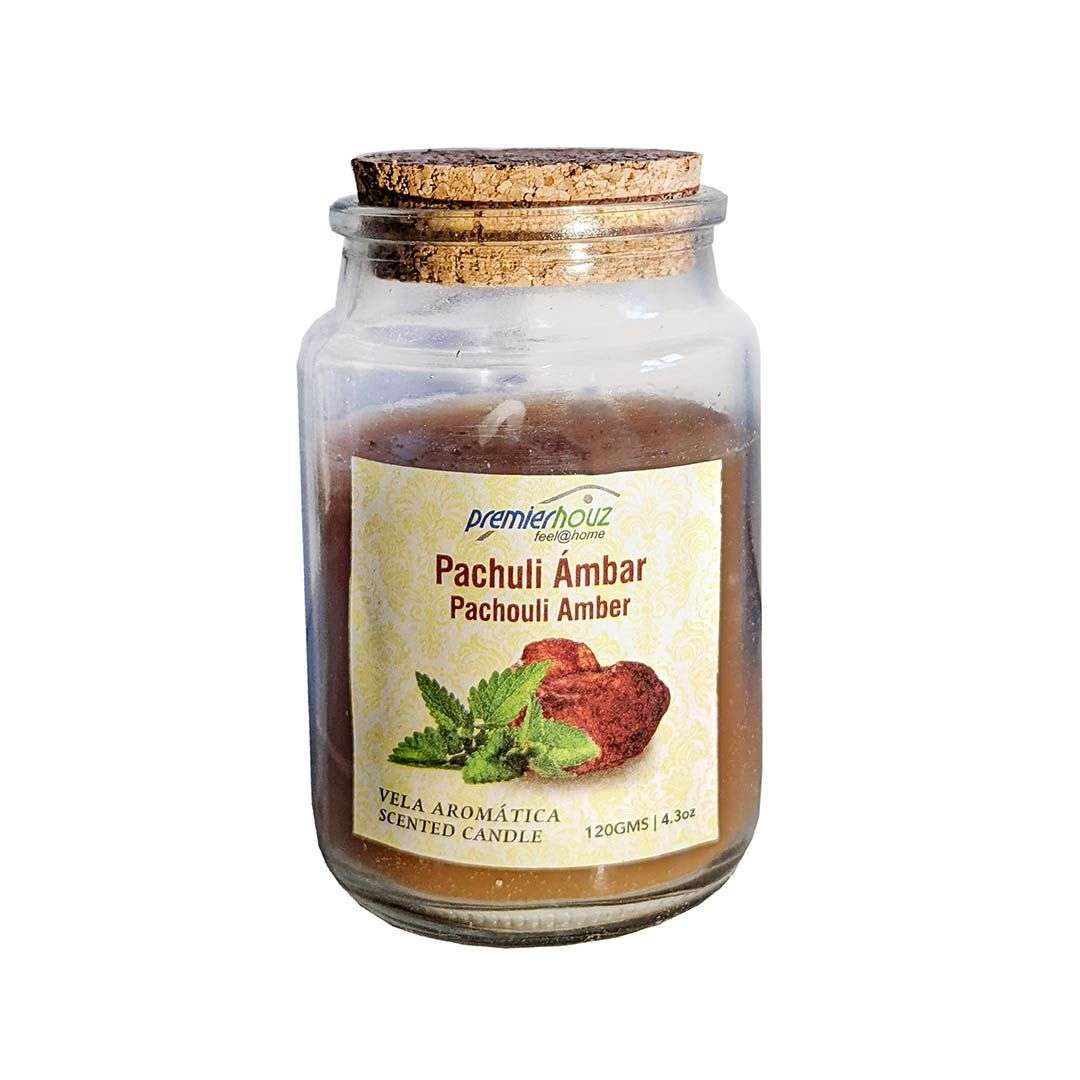 Vela Aromática con aroma a Pachuli Ámbar en frasco de vidrio.