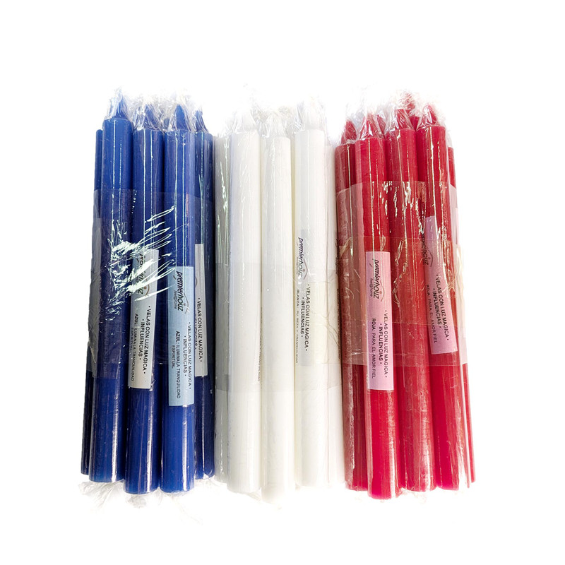 - Contenido: 30 velas lisas ( 10 azules, 10 blancas y 10 rojas)